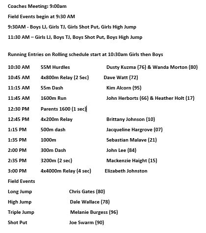 Running Entries on Rolling schedule start at 8:30am Girls then Boys.